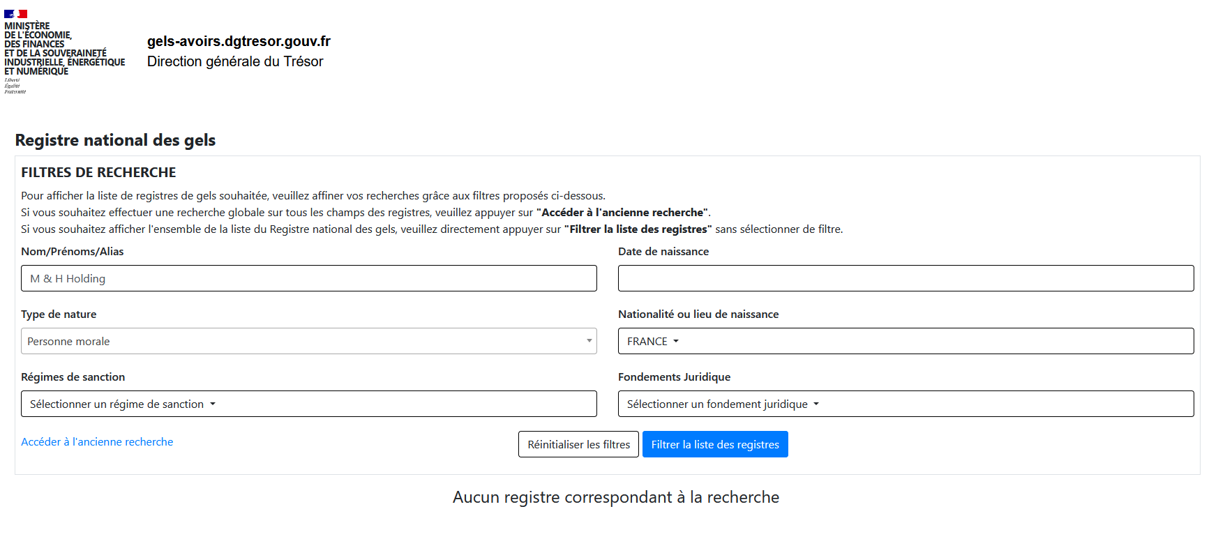 | 5 mars 2026 | REGISTRE NATIONAL DU GEL DES AVOIRS PERSONNE MORALE | FORMALITES PARQUET | REGISTRE NATIONAL DU GEL DES AVOIRS PERSONNE MORALE - 74 KB |